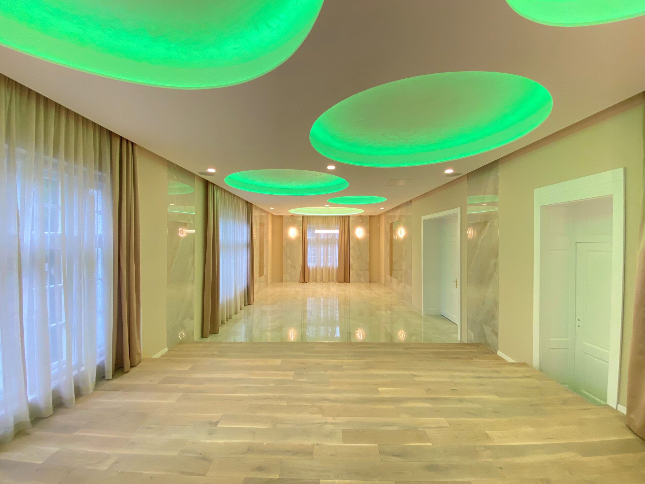 A fogadótér és a nagyterem világos, fényes borítást kapott, tükrökkel, gyűrűket szimbolizáló lámpákkal és választható színű hangulatvilágítással. Az épület homlokzata is megújult, kertjében gyönyörű parkot alakítottak ki, pihenő padokat telepítettek és belső parkolókat építettek. Az íves, kovácsoltvas korláttal ellátott lépcső körülöleli a díszkertet, esküvői csoportfotózásokhoz kiválóan alkalmas.