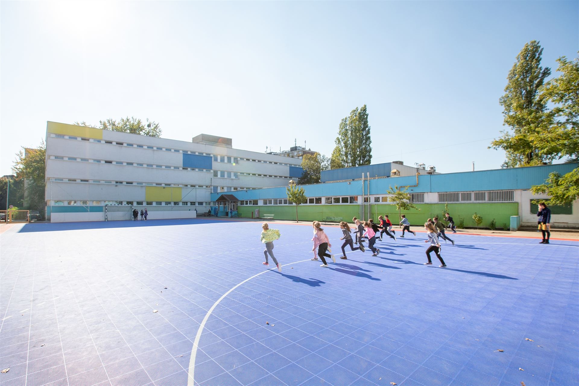 A Bárdos Lajos Általános Iskola udvarán 42 x 22 m-es, multifunkciós, EPDM gumiborítású, labdarúgó, kézilabda, kosálabda, röplabda és tenisz játékra alkalmas pályát alakítottak ki.